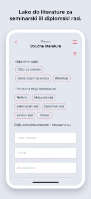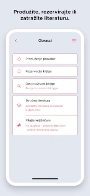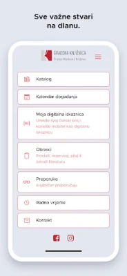 Aplikacija je namijenjena korisnicima Gradske knjižnice "Franjo Marković" Križevci uz pomoć koje korisnici mogu pretražiti e-katalog knjižnice, pregledati kalendar događanja u knjižnici, generirati svoj korisnički broj u barkod, produžiti posudbu građe, rezervirati građu, provjeriti da li knjižnica posjeduje primjerak neke građe ili zatražiti literaturu za seminarski rad. Unutar aplikacije nalaze se i Radno vrijeme knjižnice, odgovori na Česta pitanja, kontakt podaci svih odjela i službi knjižnice te poveznice na društvene mreže.