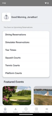 - Make reservations - Order food from course, and togo orders - Sign up for events - Book Tee Times and Simulator Times - Book Tennis Platform Tennis and Squash Times - And More