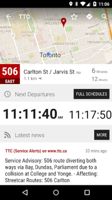This app provides the schedule (offline & real-time) as well as real time service alerts and news from @StreetcarTO, @TTCnotices & @TTChelps on Twitter.